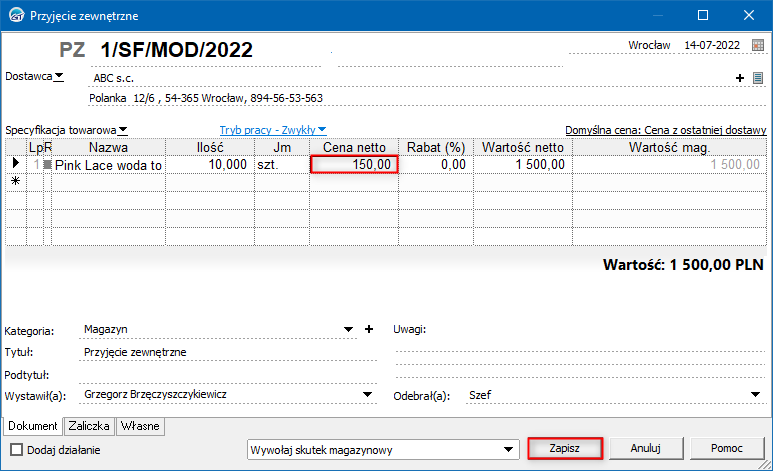 3. Przejść do dokumentu i edytować wartości na poprawne. Zmiany zatwierdzić przyciskiem Zapisz.