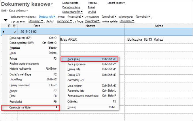 1. Na liście, która ma zostać skopiowana, kliknąć Prawym Przyciskiem Myszy – Operacje na liście – Kopiuj Listę lub skorzystać z kombinacji klawiszy Ctrl + Shift + C. Po wykonaniu tej operacji lista zostanie skopiowana do schowka.