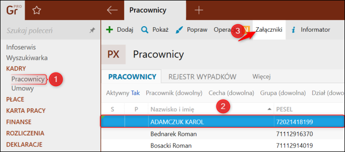 1. Przejść do modułu Pracownicy, zaznaczyć kartotekę pracownika i kliknąć górne menu Załączniki.