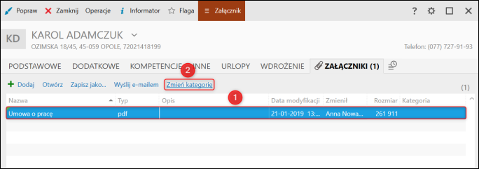 2. Zaznaczyć wcześniej dodany załącznik i kliknąć Zmień kategorię.