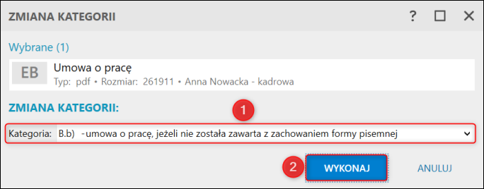 3. Ustawić odpowiednią Kategorię dla danego dokumentu i zatwierdzić przyciskiem Wykonaj.