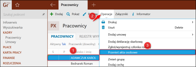 1. Wciąż będąc w module Pracownicy, zaznaczyć pracownika, którego dokumenty zostaną wyeksportowane, rozwinąć górne menu Operacje i wybrać Przenieś akta osobowe.