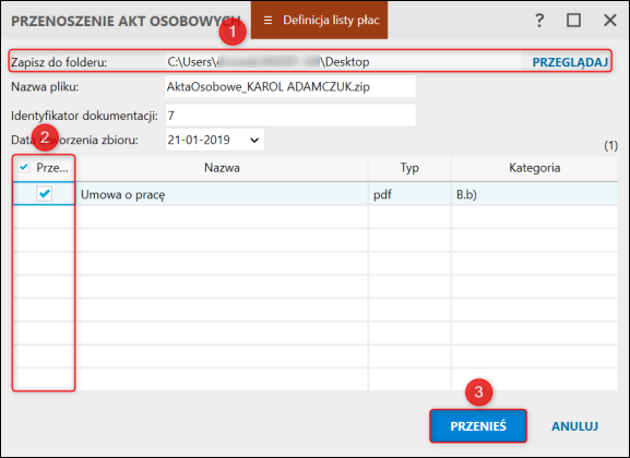 2. Wybrać Folder, w którym zostanie zapisany plik, zaznaczyć Dokumenty, które zostaną wyeksportowane i zatwierdzić przyciskiem Przenieś.
