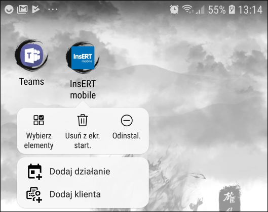 ​Od wersji 1.1.2 aplikacji InsERT mobile​, istnieje możliwość dodawania działań oraz klientów bez otwierania aplikacji i przechodzenia do konkretnego modułu. W tym celu wystarczy nacisnąć i przytrzymać ikonę aplikacji InsERT mobile, dzięki czemu - oprócz podstawowych funkcji systemu android - podpowiedzą się dwie dodatkowe funkcje.