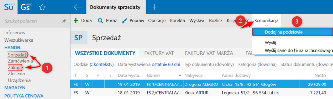 1. Przejść do modułu Sprzedaż lub Zakup (w zależności od tego, czy wczytywana będzie faktura sprzedaży, czy zakupu), rozwinąć górne menu Komunikacja i kliknąć Dodaj na podstawie.