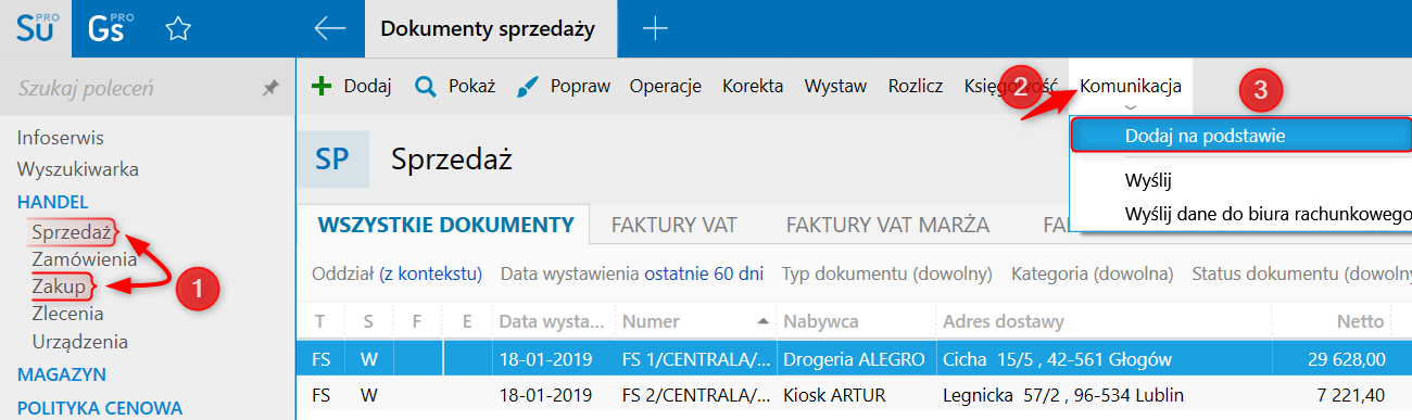 1. Przejść do modułu Sprzedaż lub Zakup (w zależności od tego, czy wczytywana będzie faktura sprzedaży, czy zakupu), rozwinąć górne menu Komunikacja i kliknąć Dodaj na podstawie.