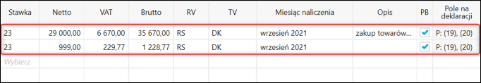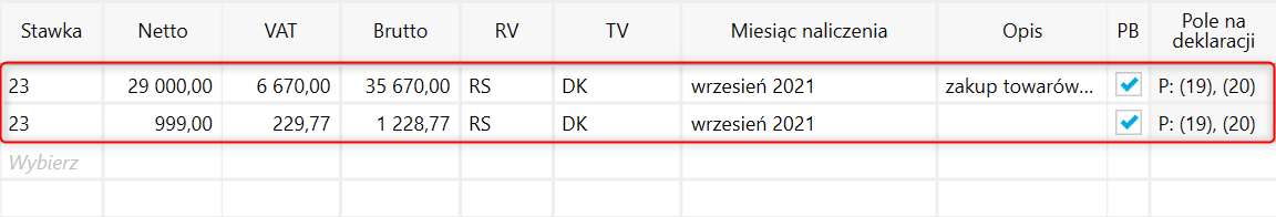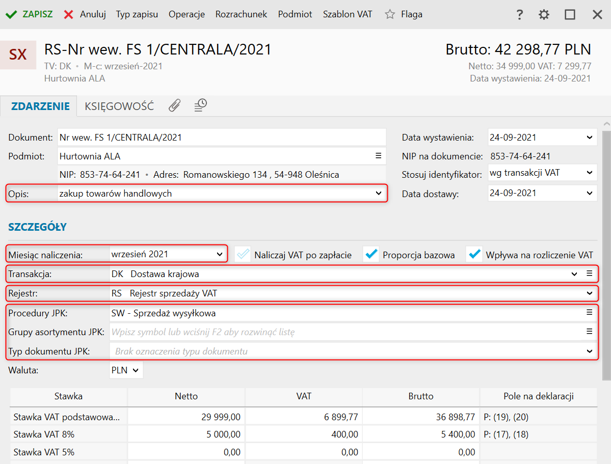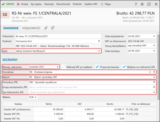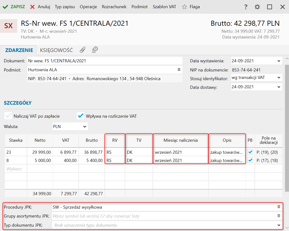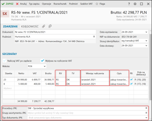 W zapisie prostym Opis, Proporcję bazową, Transakcje, Miesiąc naliczenia oraz Rejestr wprowadza się dla całego dokumentu, w złożonym dla każdej pozycji części Szczegóły. W obu zapisach Procedury, Grupy asortyment i Typ JPK wprowadza się dla całego dokumentu.