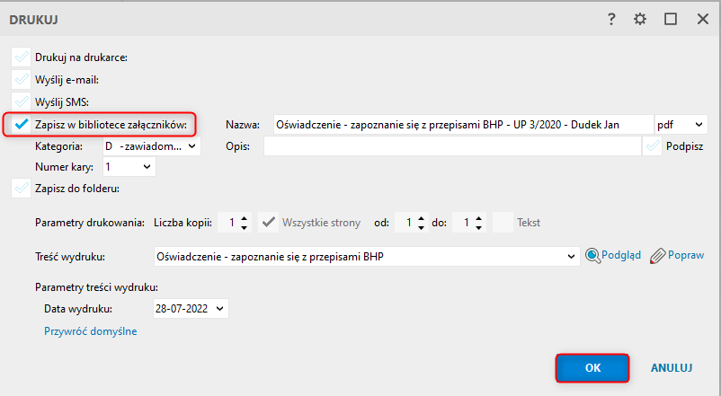 ​W momencie wydruku dokumentu kadrowego można automatycznie przenieść go do załączników pracownika, aby zapisać go jako e-dokumentację. W tym celu w oknie Drukuj należy zaznaczyć opcję Zapisz w bibliotece załączników. Po zaznaczeniu opcji możliwe jest wprowadzenie Nazwy i Opisu dokumentu, oraz jego Kategorii. Dodatkowo plik można opatrzyć certyfikatem kwalifikowanym, zaznaczając opcję Podpis.