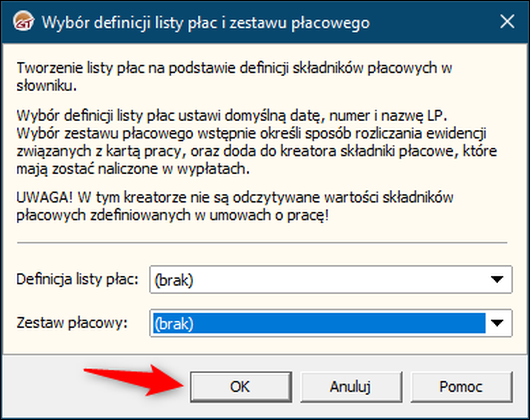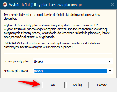 2. Jako definicję listy płac oraz zestaw płacowy nie wybierać nic, ponieważ premie zwykle nie są w żaden sposób predefiniowane. Kliknąć OK.