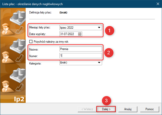 3. Wskazać miesiąc listy płac i datę wypłaty, wprowadzić jej nazwę i numer. Następnie przejść Dalej.