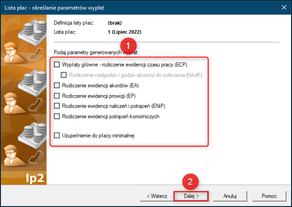4. W omawianym przypadku (premie) w parametrach generowanych wypłat nie zaznaczać żadnej opcji i przejść Dalej. Jeżeli lista płac dotyczy innej sytuacji, należy zaznaczyć parametry odpowiadające danemu przypadkowi.