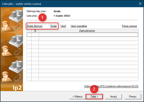 5. Wskazać umowy przy użyciu opcji Dodaj (pojedynczo) lub Dodaj zbiorczo (możliwość wskazania wszystkich lub całego działu) i przejść Dalej.