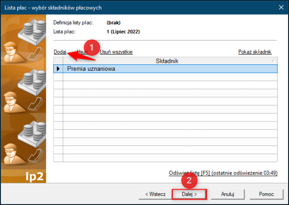 6. Wybrać składnik klikając Dodaj. W tym przypadku jest to premia uznaniowa. Po jej wyborze przejść Dalej.