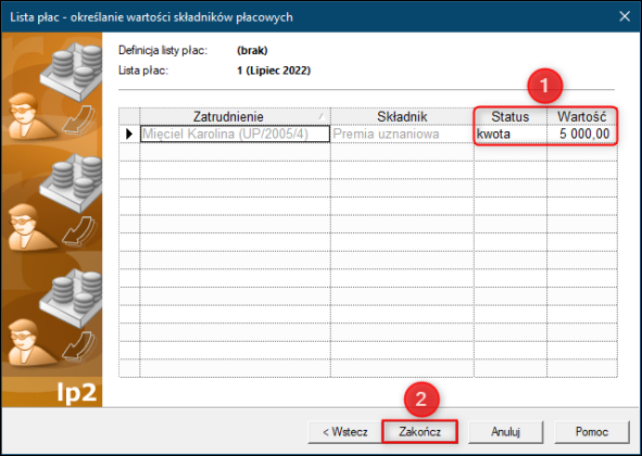 7. Ponieważ według definicji składnik nie posiada wartości, należy zmienić status na kwotę i wprowadzić wartość premii dla każdego pracownika. Po wprowadzeniu wartości kliknąć Zakończ.