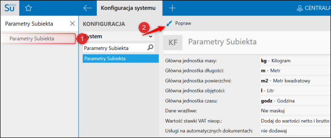 1. W wyszukiwarce wpisać Parametry Subiekta, przejść do ich konfiguracji i kliknąć górne menu Popraw.