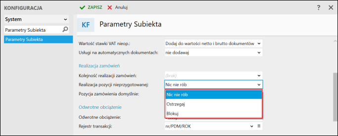 3. Parametr Realizacja pozycji nieprzygotowanej dostępny w wersji PRO pozwala ustawić działanie systemu podczas próby realizacji zamówienia w sytuacji, gdy nie wszystkie pozycje zostały przygotowane do wydania. Możliwe do wyboru są następujące polecenia: