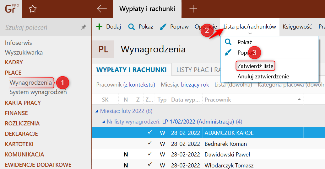 1. Przejść do modułu Płace – Wynagrodzenia i Zatwierdzić listę płac.