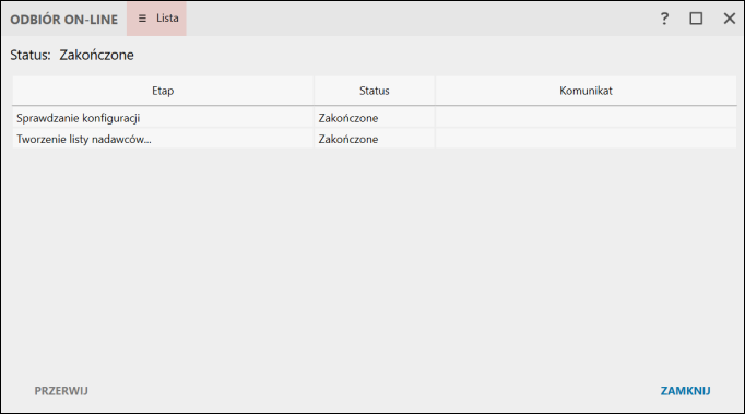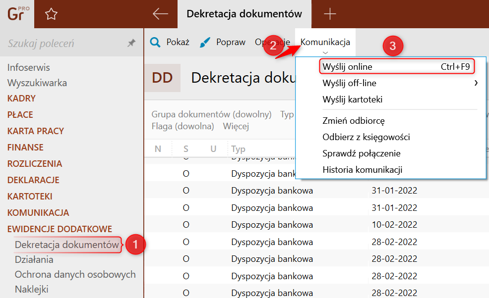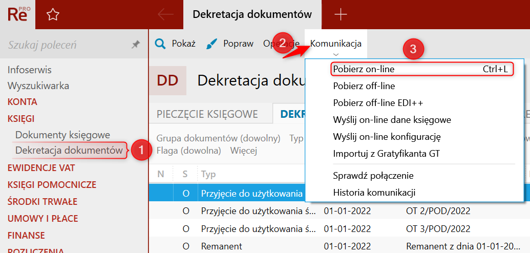 1. W module Księgi – Dekretacje dokumentów wybrać menu Komunikacja – Pobierz on-line.