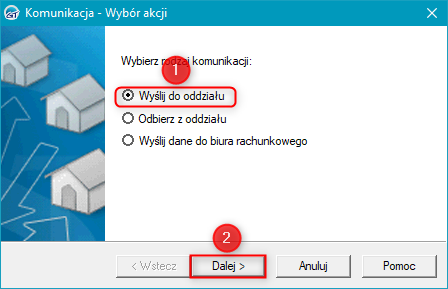 2. W oknie, które się wyświetli wybrać rodzaj komunikacji jako Wyślij do oddziału i przejść Dalej.