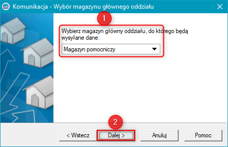 3. W następnym kroku wybrać z listy magazyn główny oddziału, do którego będą wysłane dane i przejść Dalej.