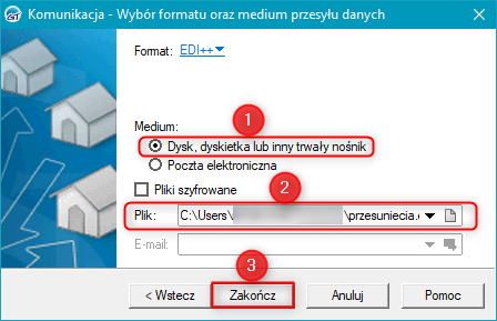 5. W oknie Komunikacja – Wybór formatu oraz medium przesyłu danych, w polu Plik wpisać ścieżkę bądź wskazać dowolną lokalizację oraz nazwę pliku wymiany i kliknąć przycisk Zakończ. Dodatkowo od wersji 1.52 eksportowane dane można zaszyfrować, zaznaczając opcję Pliki szyfrowane. W przypadku użycia tej opcji program zapyta użytkownika o hasło, którym ma zaszyfrować dane.