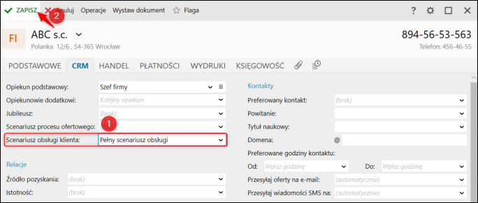 2. Przejść na zakładkę CRM, z listy rozwijalnej Scenariusz obsługi klienta wybrać odpowiedni scenariusz i zatwierdzić przyciskiem Zapisz.