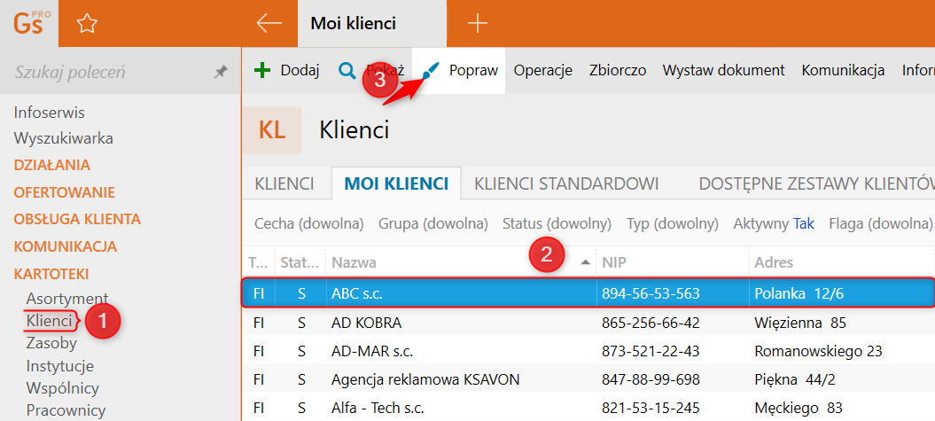 1. Przejść do modułu Klienci, zaznaczyć klienta i kliknąć górne menu Popraw.