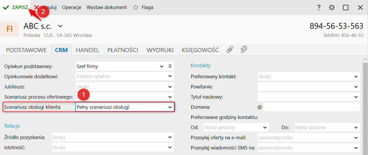 2. Przejść na zakładkę CRM, z listy rozwijalnej Scenariusz obsługi klienta wybrać odpowiedni scenariusz i zatwierdzić przyciskiem Zapisz.