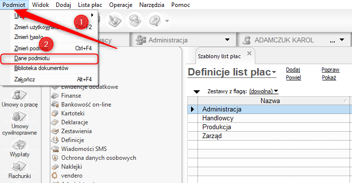 Dane podmiotu to informacje o firmie, które wyświetlają się na dokumentach wystawianych z programu. Należą do nich m.in. nazwa, adres, NIP (edycja blokowana jest po rejestracji programu), REGON, adres e-mail. Edycja tych danych jest możliwa poprzez górne menu Podmiot – Dane podmiotu.
