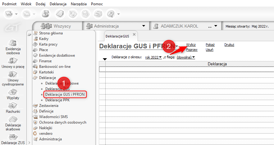 1. Przejść do modułu Deklaracje ​ Deklaracje GUS i PFRON, a następnie wybrać opcję Wylicz.