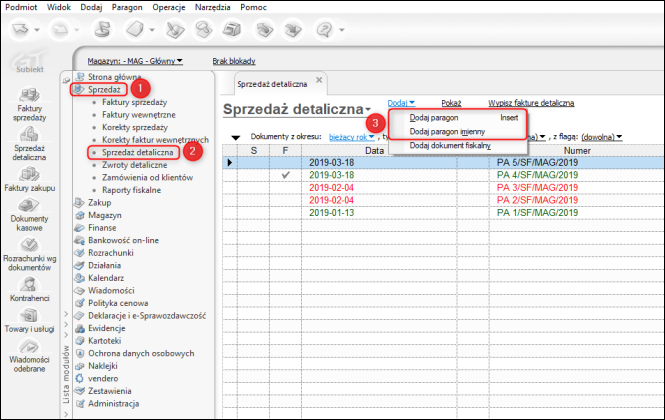 1. Z listy modułów wybrać Sprzedaż – Sprzedaż detaliczna, rozwinąć link Dodaj i wybrać jedną z dwóch opcji: