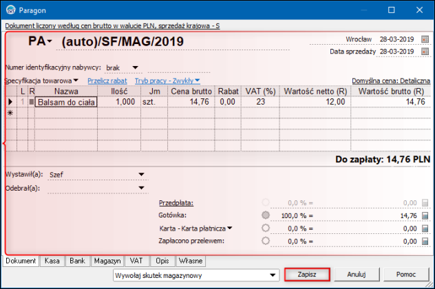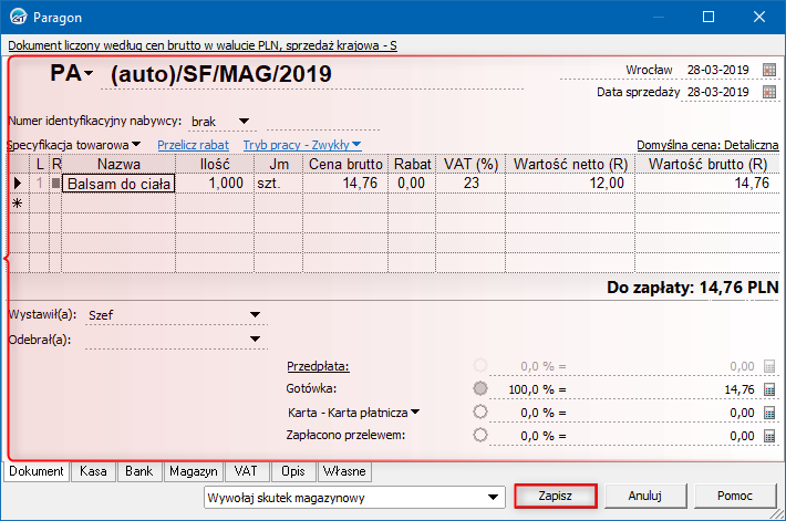 2. Po wprowadzeniu towarów oraz formy płatności (w przypadku paragonu imiennego – również kontrahenta) zatwierdzić przyciskiem Zapisz.