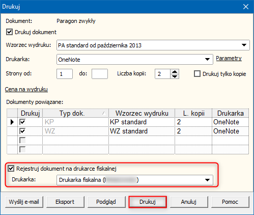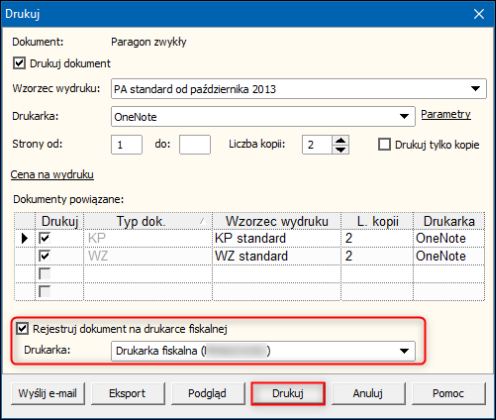 3. W oknie Drukuj należy zaznaczyć Rejestruj dokument na drukarce fiskalnej i wybrać drukarkę, która ma zarejestrować paragon. Jeżeli nie ma tutaj odpowiedniej drukarki, należy ją dodać. Temat e-Pomocy technicznej opisujący to zadanie dostępny jest tutaj.
