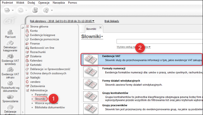 1. Przejść do modułu Słowniki i wejść w słownik Ewidencje VAT.