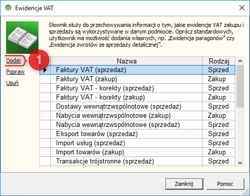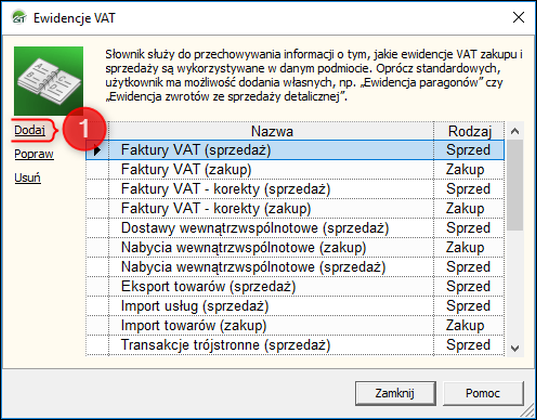 2. W oknie Ewidencje VAT kliknąć Dodaj.