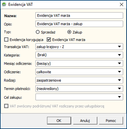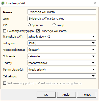 3. Wpisać Nazwę, określić Typ jako Zakup, zaznaczyć Ewidencja VAT marża, uzupełnić odpowiednio pozostałe pola formularza i zatwierdzić przyciskiem Zapisz.