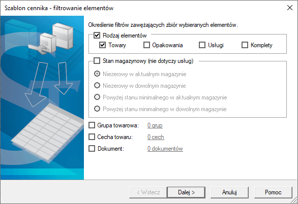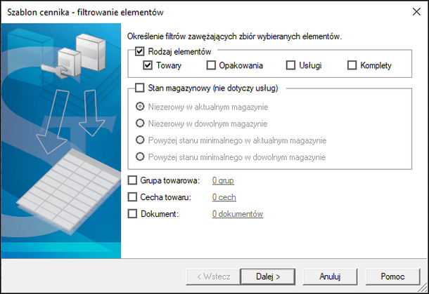 2. Przy użyciu filtrów wskazać odpowiednie kartoteki, które mają zostać przeniesione na wydruk cennika.