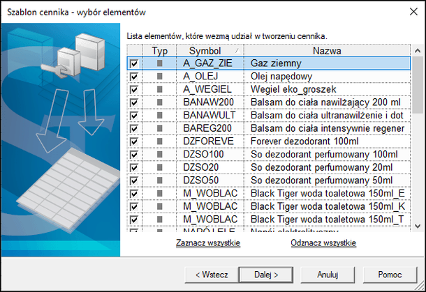 3. Z wyfiltrowanego asortymentu zaznaczyć odpowiednie kartoteki i przejść Dalej.