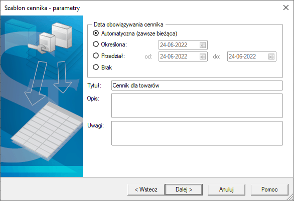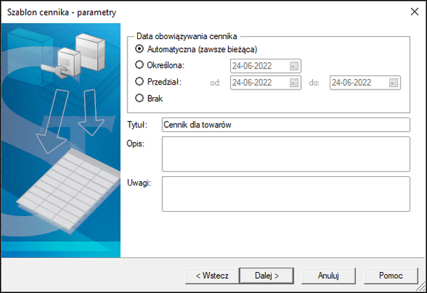 5. Wskazać datę obowiązywania cennika, tytuł i opcjonalnie opis, oraz uwagi.