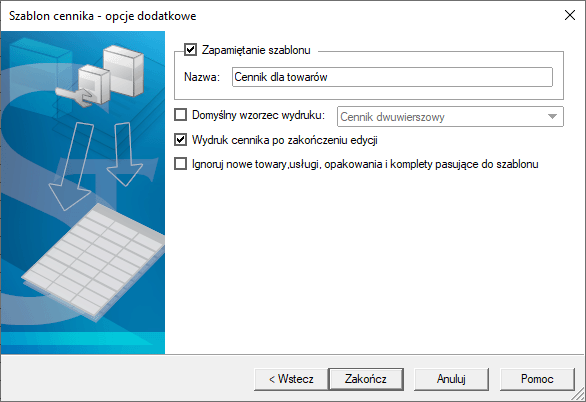 6. Jeżeli szablon będzie wykorzystywany wielokrotnie, można zaznaczyć Zapamiętanie szablonu. Wybór opcji Zakończ spowoduje wywołanie okna wydruku z możliwością wyboru wzorca.
