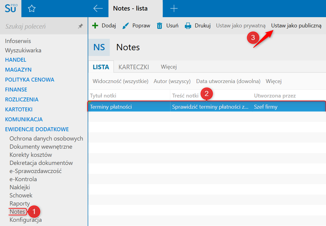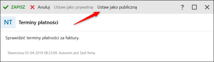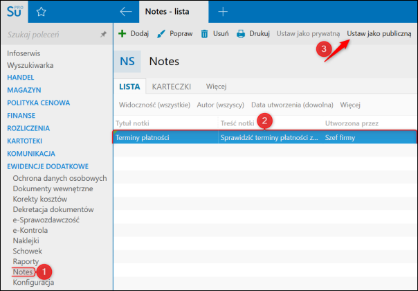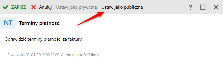 Przejść do modułu Notes, zaznaczyć odpowiednią notatkę, następnie kliknąć górne Operacje – Ustaw jako publiczną.