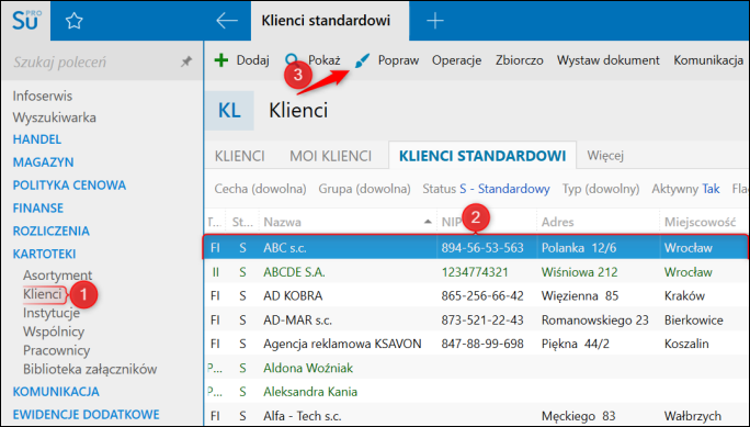 1. Przejść do modułu Klienci, zaznaczyć kontrahenta, następnie kliknąć górne menu Popraw.