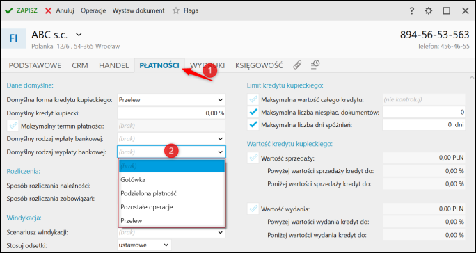 2. Na zakładce Płatności wybrać z listy Domyślny rodzaj wpłaty/wypłaty bankowej.