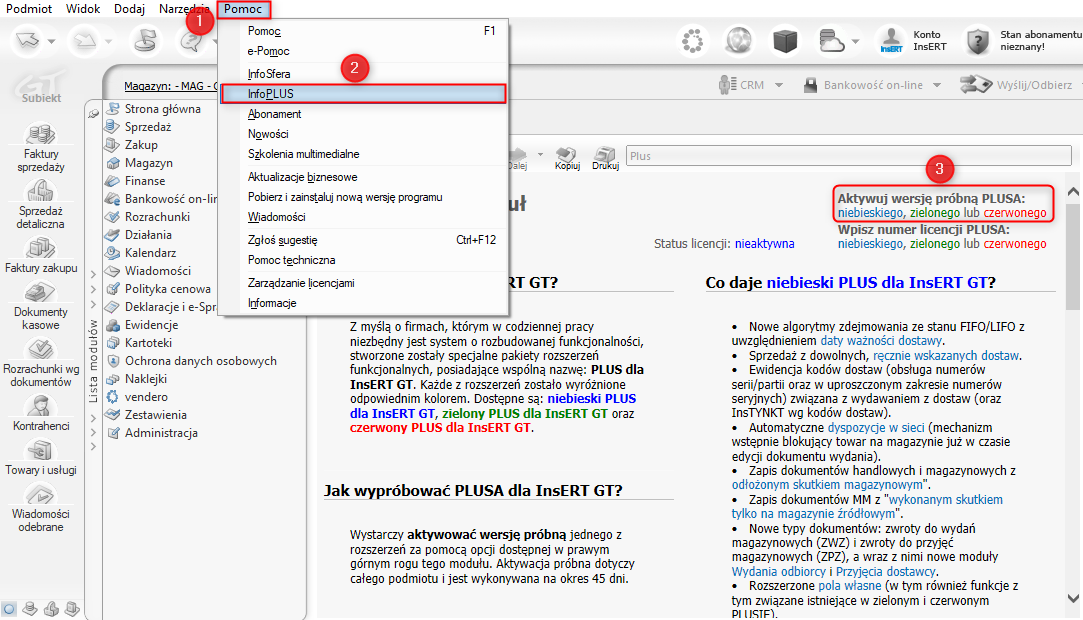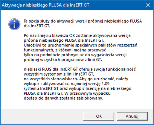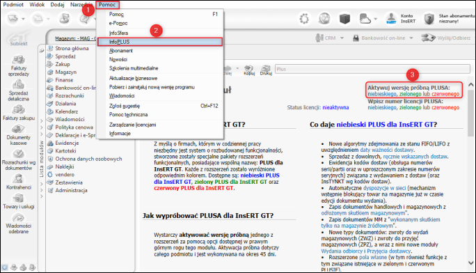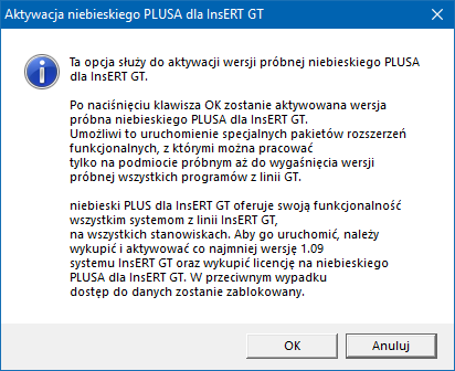 ​Programy linii InsERT GT umożliwiają przetestowanie funkcjonalności zielonego, niebieskiego i czerwonego PLUSA dla InsERT GT. Aktywowanie wersji próbnej dowolnego PLUSA, możliwe jest tylko na podmiocie próbnym. W tym celu należy: