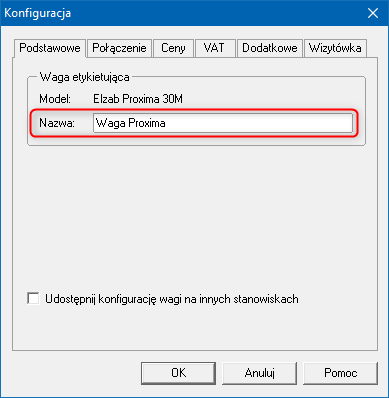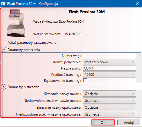 6. W oknie, które się wyświetli wprowadzić dane niezbędne do prawidłowego połączenia urządzenia z programem tj. Numer wagi, Rodzaj połączenia, Nazwa portu, Prędkość transmisji. Numer portu COM można odnaleźć w Menadżerze Urządzeń systemu Windows, pozostałe parametry są do odczytania w instrukcji obsługi urządzenia. W sekcji parametry biznesowe można określić parametry drukowanych etykiet. Po ustawieniu parametrów kliknąć przycisk OK.