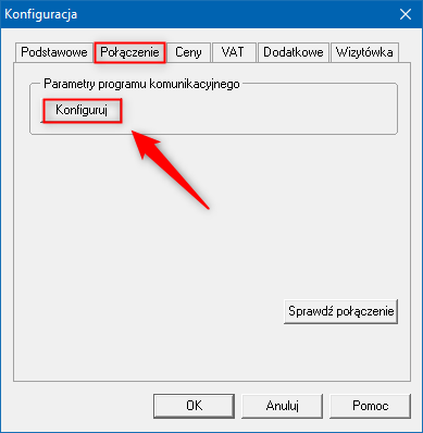 5. Na zakładce Połączenie kliknąć Konfiguruj w sekcji Parametry programu komunikacyjnego.