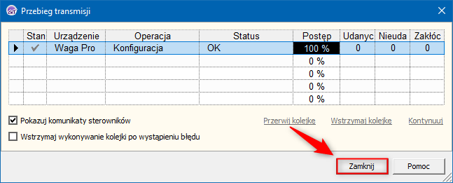 7. W oknie Przebieg transmisji kliknąć przycisk Zamknij.