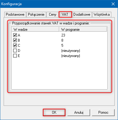9. Na zakładce VAT przypisać stawki podatku na wadze do stawek wprowadzonych w programie. Urządzenie dodać klikając przycisk OK.