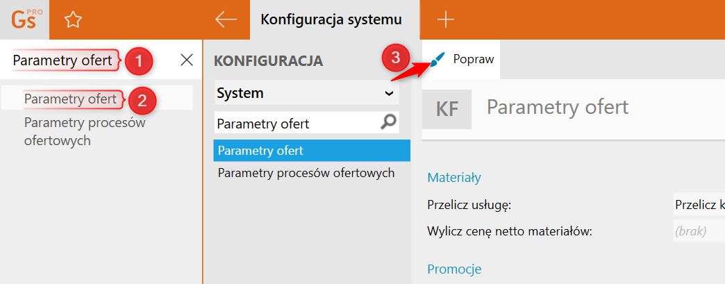 Aby przejść do Parametrów ofert, należy w lewym, górnym rogu programu, w wyszukiwarce wpisać Parametry ofert, wejść w wyszukany moduł i kliknąć górne menu Popraw.