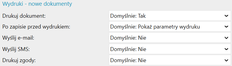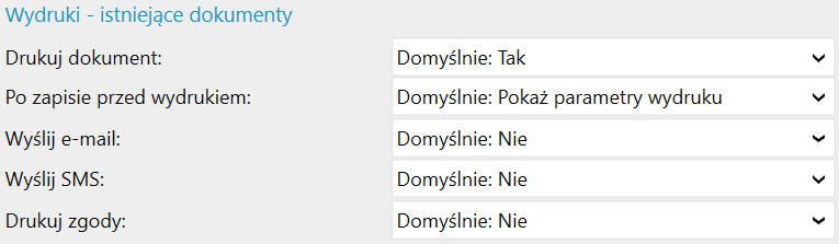 Po zapisie dokumentu najczęstszą operacją jest jego wydruk. Operacja ta przebiega jednak inaczej, gdy zapis dotyczy nowego dokumentu oraz gdy zapis dotyczy poprawianego dokumentu. Domyślne wartości dla wszystkich dokumentów sprzedaży zostały ustawione następująco.